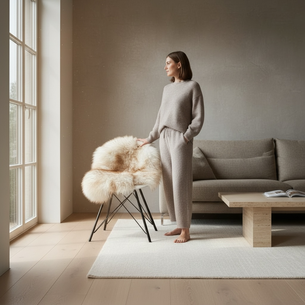 De schapenvacht vangt het licht en brengt warmte in elke hoek van je ruimte.